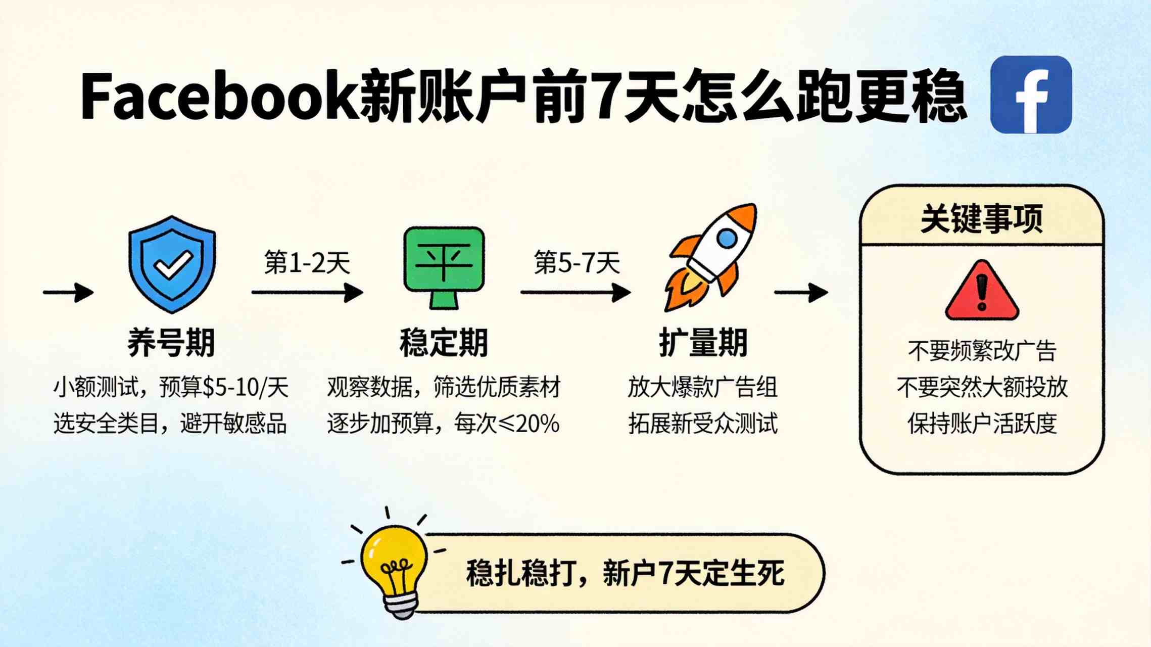 Facebook 新账户前 7 天,真正应该做的不是拼命烧预算,而是尽量把账户带入一个更稳定的起跑状态。