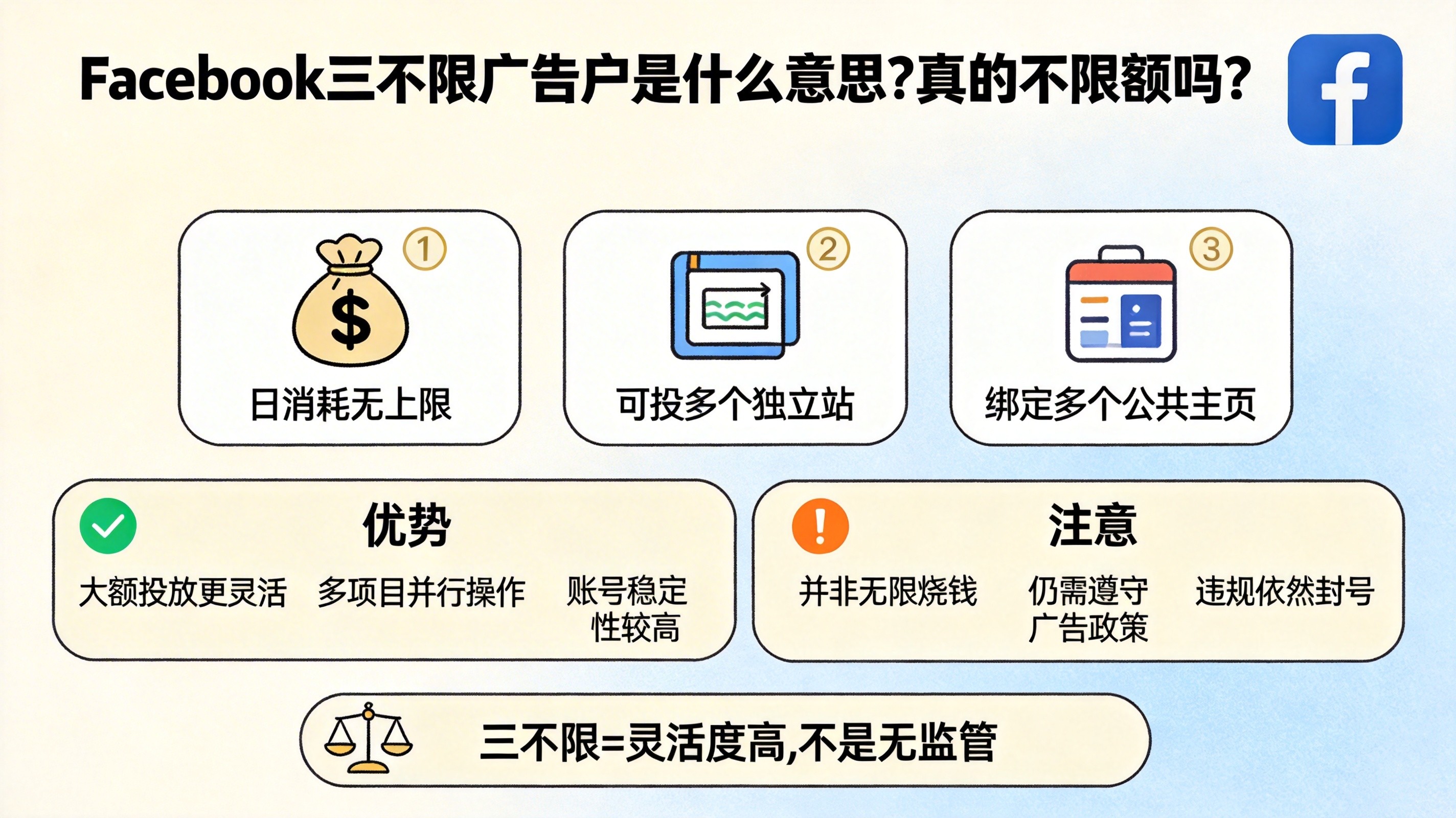 重要澄清: "不限额度"是所有三不限宣传中最需要理性看待的一点。即使是三不限户,也不可能真正没有任何额度限制。Facebook的系统对每个广告账户都有风控额度评估,完全不受额度约束的账户在技术上不存在。下一节将详细讨论这一点。