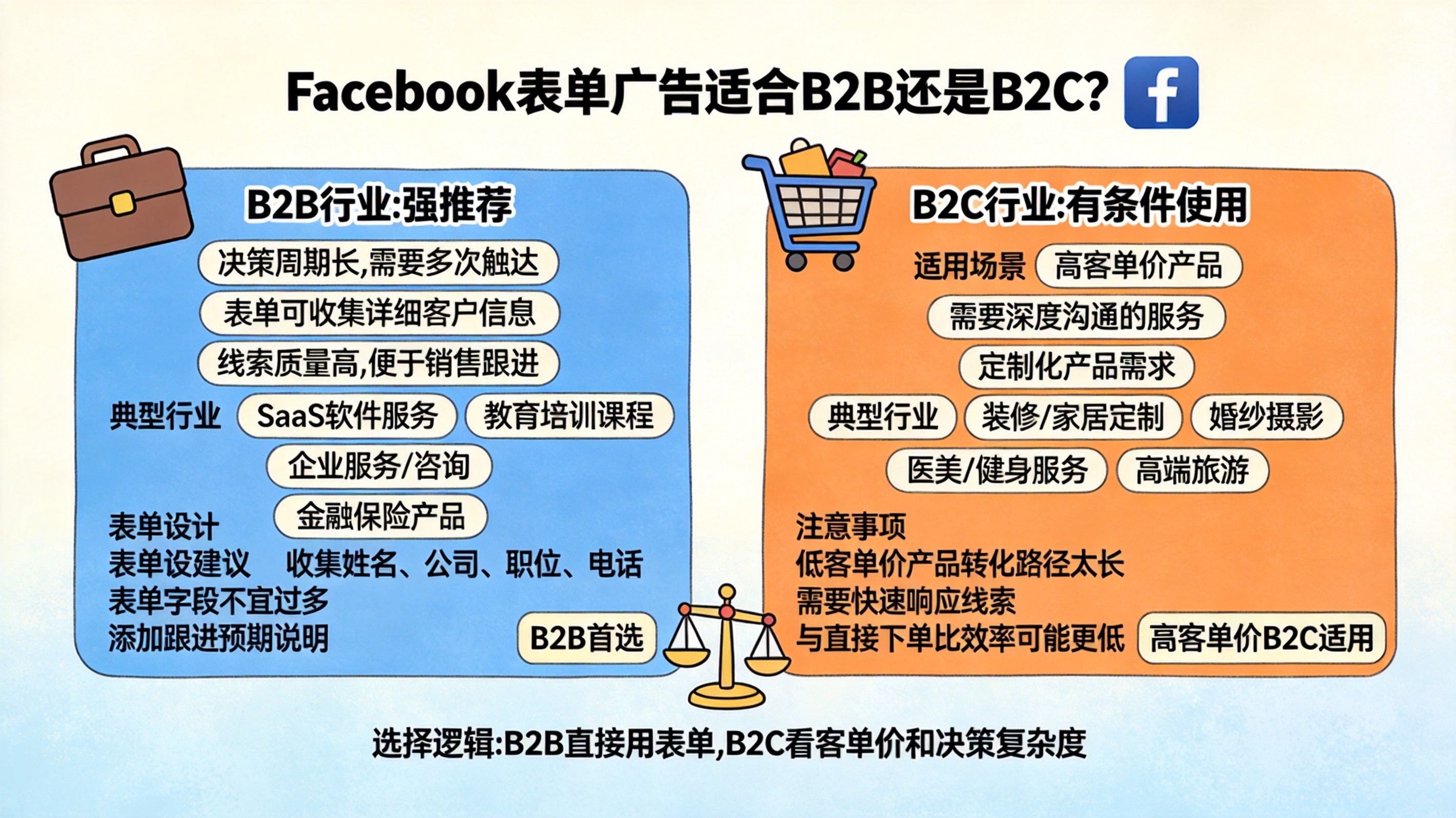简介Facebook 表单广告适合 B2B 还是 B2C?本文从成交路径、客户决策周期、线索质量、销售承接和不同业务场景出发,系统分析表单广告更适合哪些类型的业务。...