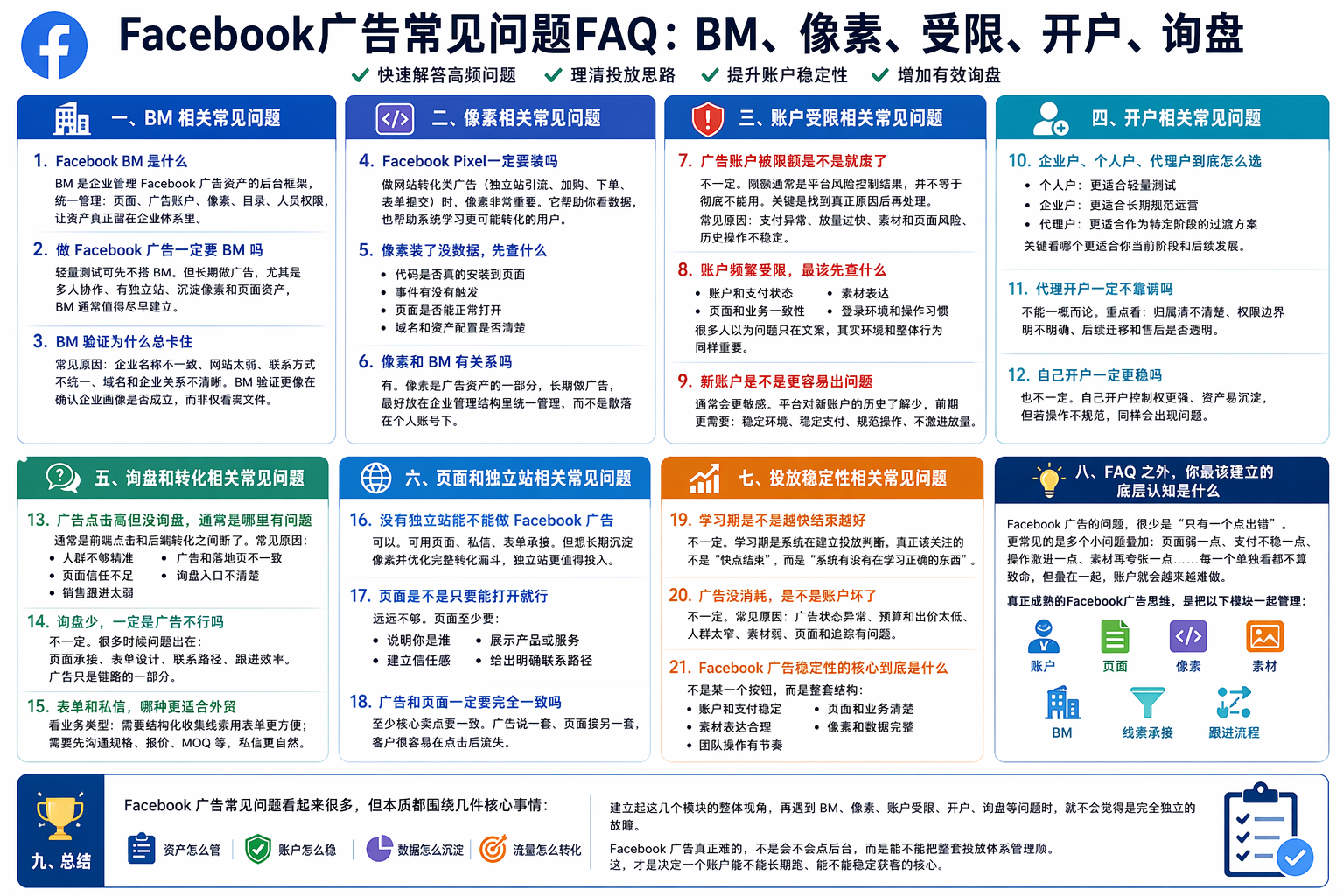 简介本文整理 Facebook 广告常见问题 FAQ,覆盖 BM、像素、账户受限、开户、询盘、页面承接和投放稳定性等高频问题,帮助企业和投手快速理清思路。 ...