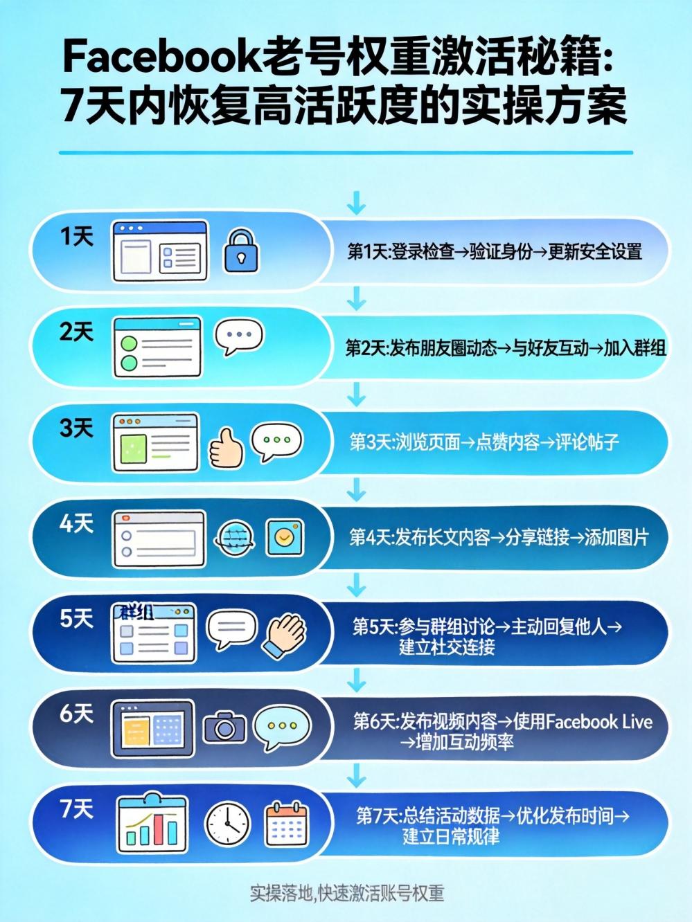 7 天激活流程的详细操作手册,包含每日任务清单、内容模板、话术库,回复"FB 激活"获取。
