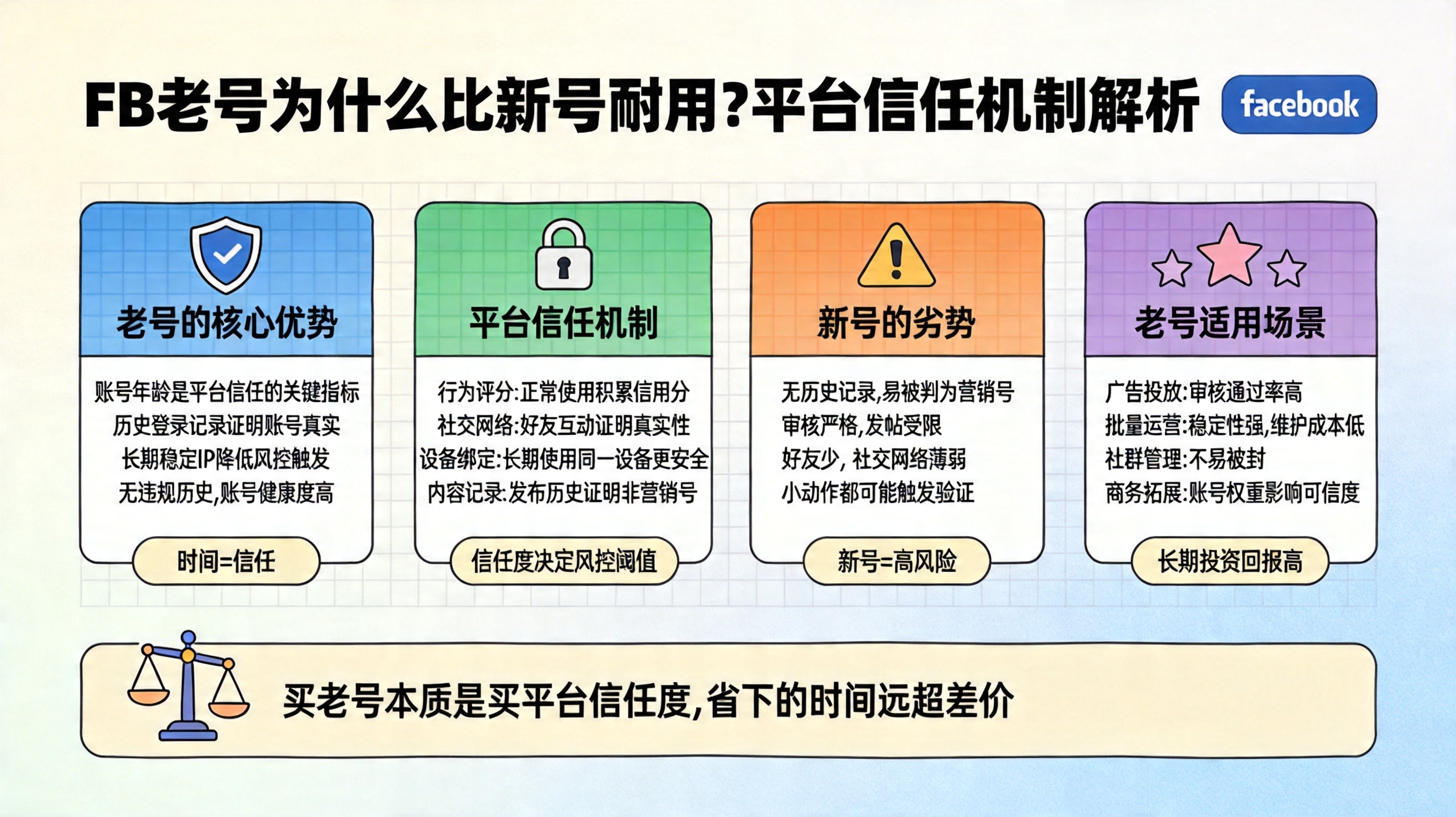 Meta描述: 从Facebook平台信任机制的底层逻辑出发,解析老号比新号耐用的根本原因,涵盖信任评分、行为建模、社交图谱三大维度。