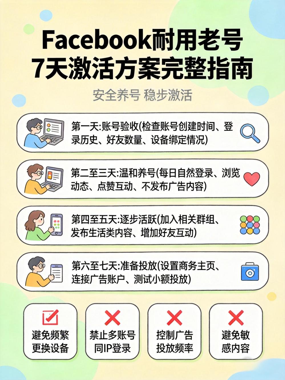 如果你刚购买了 Facebook 老号,以下是 7 天激活的具体执行步骤: