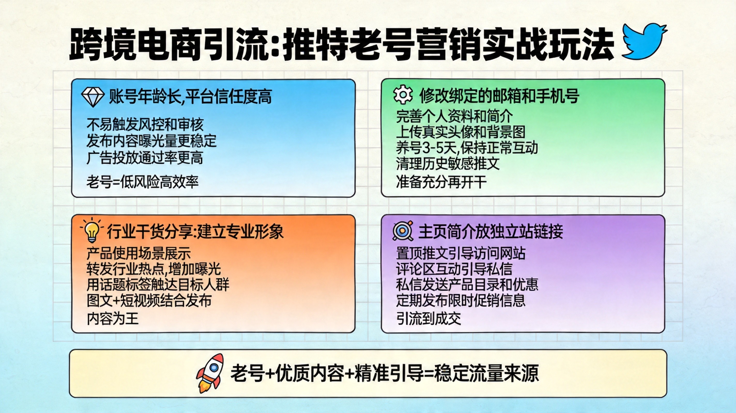 关键原则: 先输出价值建立信任,再引导转化。如果每条推文都在卖货,粉丝会取关,算法也会降低你的曝光。